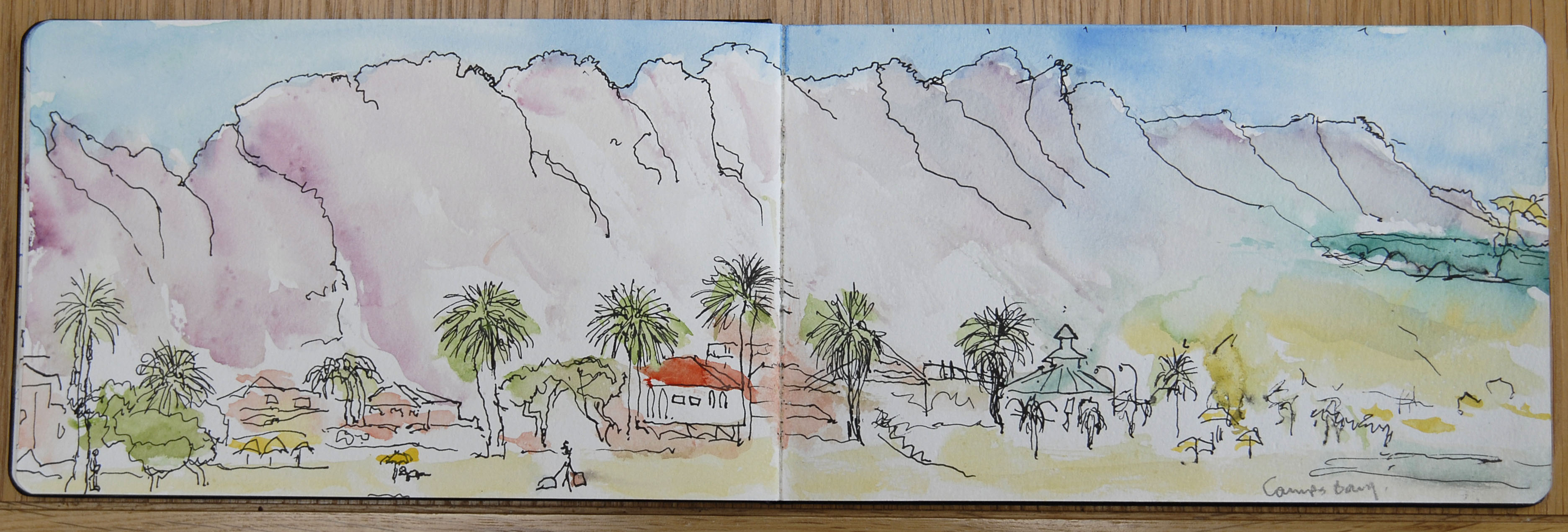 Title - Camps Bay; Medium - pen,black ink & watercolour on watercolour paper; Size - 13 x 42cm; Catalogue no.